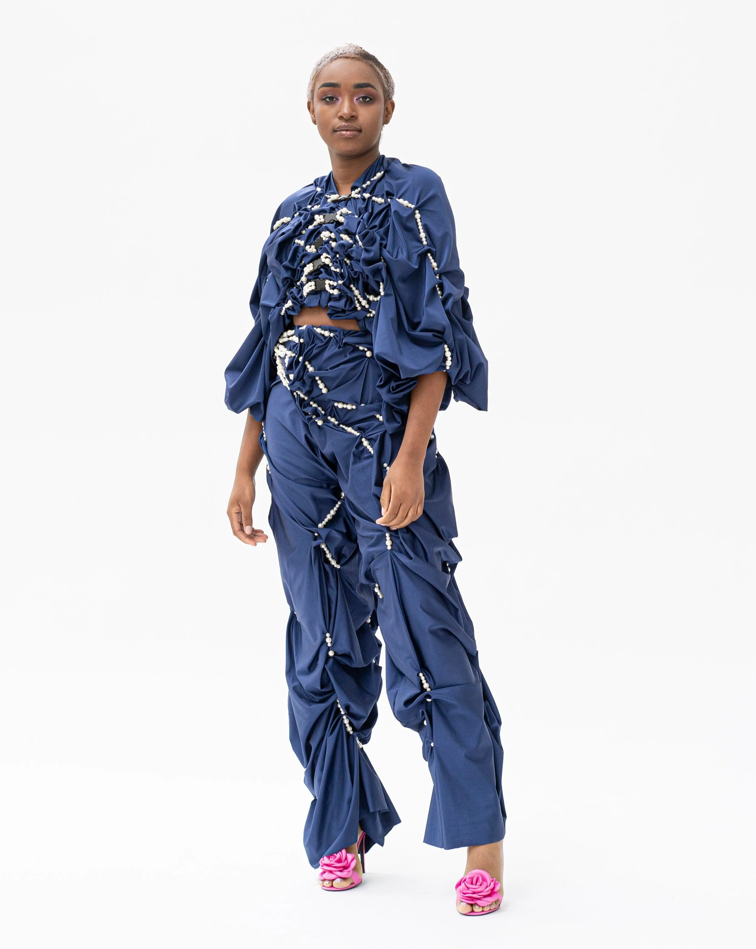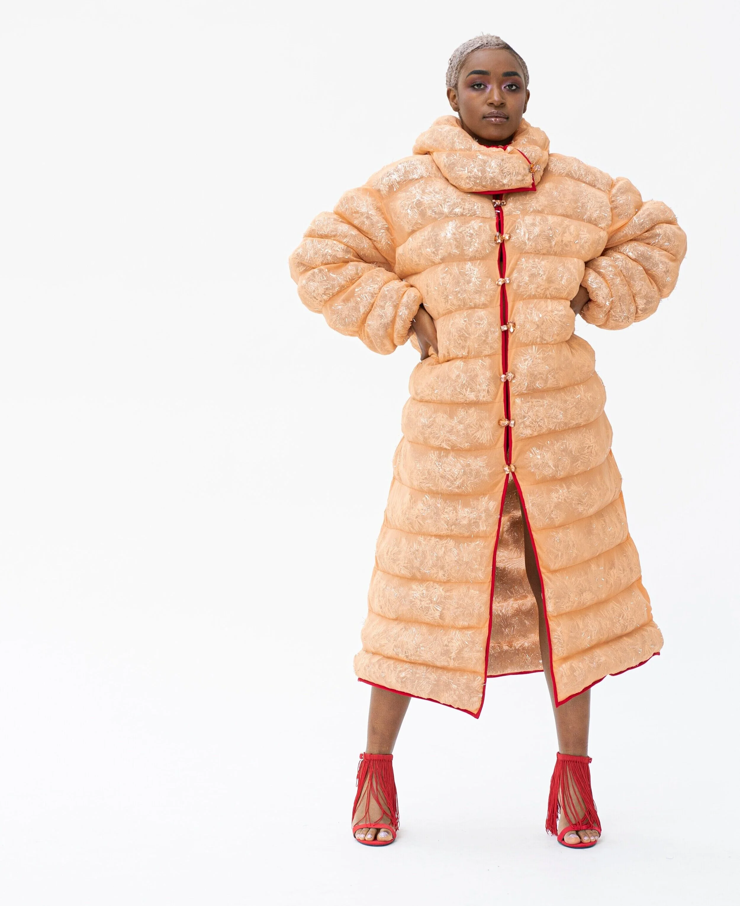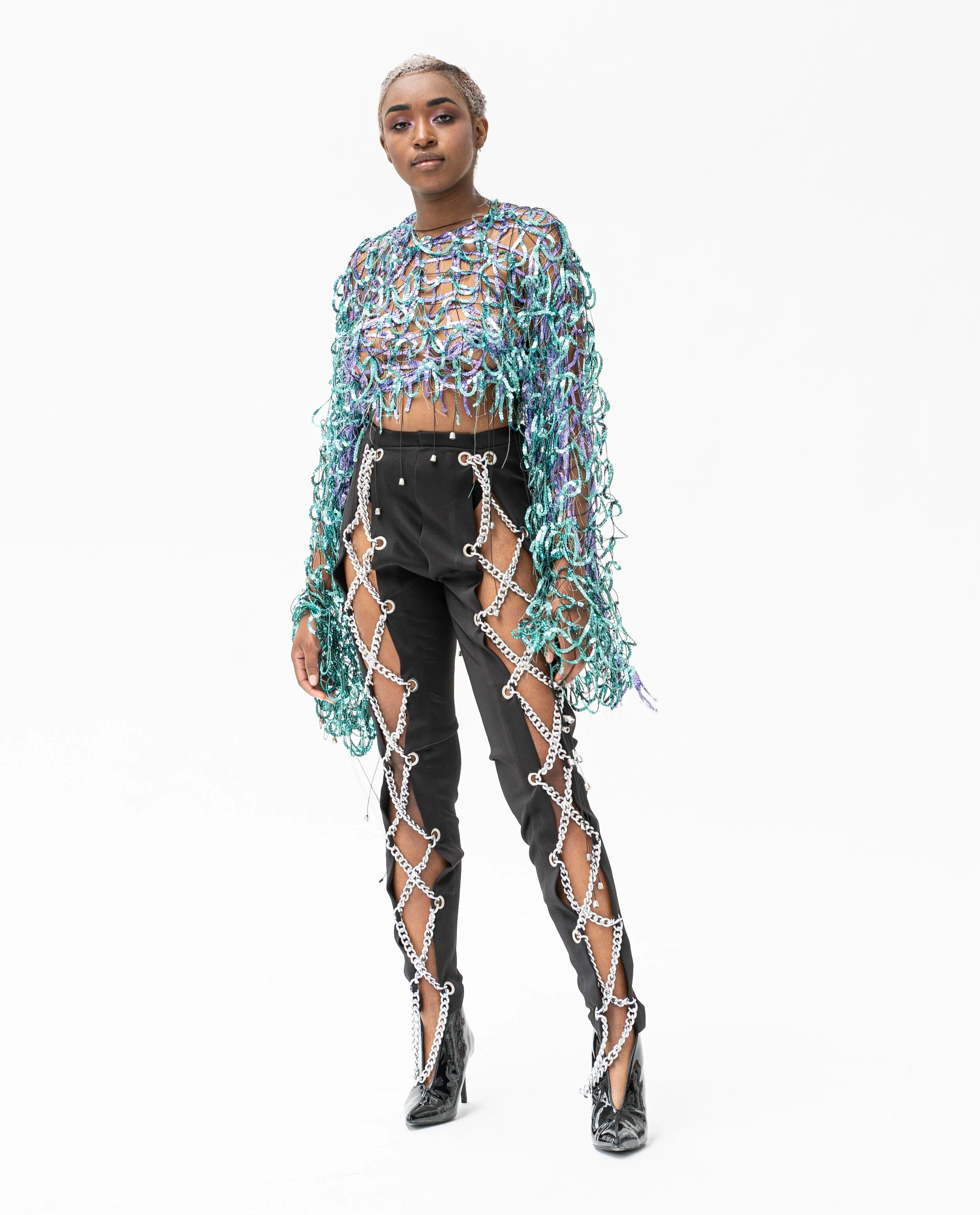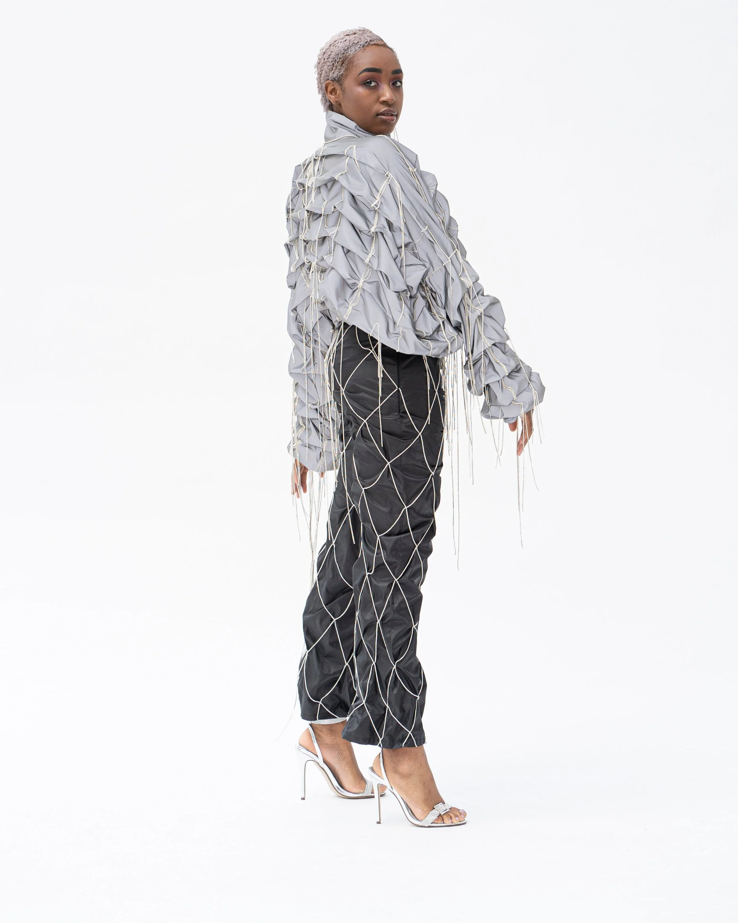 'Shiny Things' utforskar hur man kan omdefiniera uppfattningen av dekoration. Idén om vad dekorativa element är, och används till, vänds upp och ner när utsmyckningen fungerar som grundläggande verktyg för att skapa kläder och form. För att visa bredden av dekorativa tekniker och utsmyckning kan skapa, är alla plaggen olika. Arbetet behandlar också frågan om smak när det gäller utsmyckning. Genom användningen av dekorationer som ses som smaklösa vill Shiny Things ifrågasätta uppfattningarna om god och dålig smak. Material som sportväv i kombination med utsmyckning lurar ögat, och alla små dekorationer bildar tillsammans nya material. De nya sätten att använda utsmyckningar och de tidskrävande teknikerna påminner om haute couture tekniker, men på designerns eget sätt.